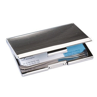 Zur sicheren Aufbewahrung und zum optimalen Schutz von Karten. Haptisch erfahrbare, gerillte Oberfläche. Lieferung ohne Inhalt. · Ausführung der Oberflächenbeschaffenheit: glänzend · Farbe: silber · Maße: 9,5 x 6,2 x 0,7 cm (B x H x T) · max. Anzahl der Karten: 20 Karten · max. zulässige Abmessung der Karte wird unterstützt: 91 x 56 mm (B x H) · Werkstoff: Chrom