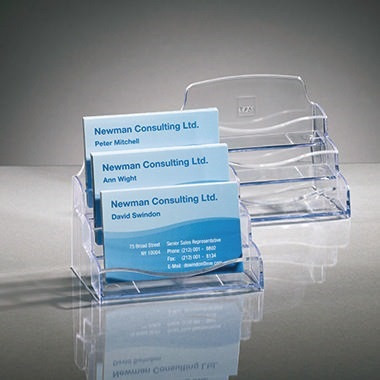 Für die perfekte Präsentation verschiedener Visitenkarten. Standfest durch rutschsichere Gummifüße. · Breite: 100 mm · max. Anzahl der Karten: 3 x 70 Karten · Werkstoff: Hartplastik · Tiefe: 80 mm · Register vorhanden: Nein · max. zulässige Abmessung der Karte wird unterstützt: 94 x 85 mm (B x H) · Höhe: 70 mm · Farbe: glasklar · Beschreibung der Besonderheiten: mit rutschsicheren Gummifüßen · Anordnung der Lage (Zugriffsseite): oben offen · Maße: 10 x 7 x 8 cm (B x H x T) · gefüllt: Nein