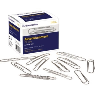 Damit klammern Sie schnell und bequem Ihre Unterlagen. Auch im modernen Büro nicht zu ersetzen. · Ausführung der Form: gewellte, runde Form · Ausführung des Gebindes: Karton · Ausführung des Inhalts (Packung): 100 St./Pack. · Länge: 77 mm · Werkstoff: Metall, verzinkt