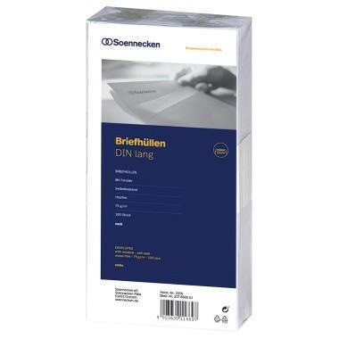 Soennecken Briefumschlag DIN lang 220 x 110 mm (B x H) mit Fenster 75g/m² mit Selbstklebung Papier weiß 100 St./Pack. · Höhe: 110 mm · Innendruck vorhanden: Nein · Maße: 220 x 110 mm (B x H) · Paper by Nature: Nein · Seidenfutter vorhanden: Nein · Verschlusstechnik: mit Selbstklebung · Forest Stewardship Council (FSC): Nein · Werkstoff: Papier · Format des Umschlages: DIN lang · Ausführung des Inhalts (Packung): 100 St./Pack. · Fenster vorhanden: Ja · Farbe: weiß · Breite: 220 mm · Blauer Engel: Nein · Ausführung des Papiertyps: holzfrei · Grammatur: 75 g/m²