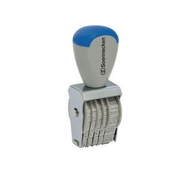 Offene Ausführung mit stabilem Metallgehäuse. Kunststoffräder zum Verstellen des Datums. Jahresbänder mit 12 Jahren, von 2017 - 2028. · Datumsformat des Aufdruckes: Monat in Zahlen · Werkstoff: Metall · Schreibfarbe des Stempels: schwarz · Material des Griffes: Kunststoff · Farbe: grau/blau · Ausführung der Drucktexte: Monat in Zahlen · Anzahl der Räder: 5 Räder · Abmessung der Stempelfläche: 21 x 3 mm (B x H) · Höhe der Schrift: 3 mm