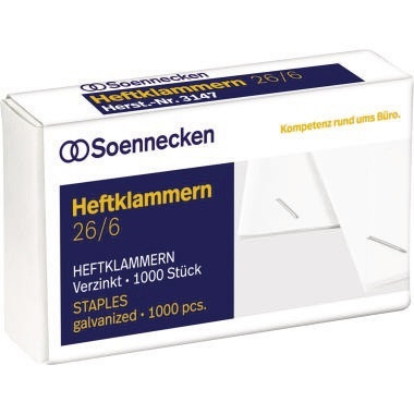 Nach DIN 7405. · Ausführung des Inhalts (Packung): 1.000 St./Pack. · Heftleistung: 30 Bl. (80 g/m²) · Material der Klammern: Stahl, verzinkt · rostfrei: Ja · Typbezeichnung der Heftklammern: 26. Jun