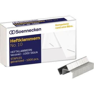 Heftklammer nach DIN 7405, rostsicher. · Typbezeichnung der Heftklammern: No. 10 · Produktverwendung: Heftzange No. 10 · Material der Klammern: Stahl, verzinkt · Ausführung des Inhalts (Packung): 1.000 St./Pack. · Heftleistung: 20 Bl. (80 g/m²)
