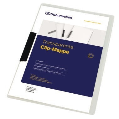 Clip-Mappe aus transparenter, flexibler Hartfolie. Mit farbigen, seitlich schwenkbaren Kunststoff-Clips. Schnelle und einfache Handhabung: Den Clip einfach nach außen schwenken, Papiere einlegen und Clip wieder schließen. · max. Anzahl der Blätter: 30 Bl. (80 g/m²) · Werkstoff: Polypropylen · Stärke: 0,4 mm · Material der Klemme: Kunststoff · Farbe der Vorderseite: transparent · Farbe der Rückseite: transparent · Farbe der Klemme: schwarz · Verwendung für Papierformat: DIN A4