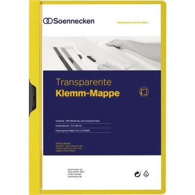 Zum Ordnen, Aufbewahren und Präsentieren von DIN A4-Dokumenten aller Art, ohne zu lochen. Mit starkem Metallclip und transparentem Vorderdeckel, Rückseite farbig. · Material der Klemme: Metall · Verwendung für Papierformat: DIN A4 · Werkstoff: Hartfolie · max. Aufbewahrungsmenge: max. 30 Bl. · max. Anzahl der Blätter: 30 Bl. (80 g/m²) · Farbe der Vorderseite: transparent · Farbe der Rückseite: gelb · Breite: 222 mm · Farbe der Klemme: schwarz · Höhe: 319 mm