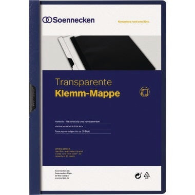 Zum Ordnen, Aufbewahren und Präsentieren von DIN A4-Dokumenten aller Art, ohne zu lochen. Mit starkem Metallclip und transparentem Vorderdeckel, Rückseite farbig. · Höhe: 319 mm · Verwendung für Papierformat: DIN A4 · max. Aufbewahrungsmenge: max. 30 Bl. · Werkstoff: Hartfolie · Material der Klemme: Metall · Farbe der Rückseite: blau · Farbe der Klemme: schwarz · Breite: 222 mm · max. Anzahl der Blätter: 30 Bl. (80 g/m²) · Farbe der Vorderseite: transparent