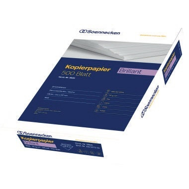 Soennecken Brillant - ein Spitzenpapier für exklusive und aufmerksamkeitsstarke Ergebnisse. Dieses Papier brilliert durch eine sehr glatte Oberfläche und erzielt damit Höchstleistungen für den anspruchsvollen Anwender. Professionelle Laufeigenschaften auf allen Bürogeräten und Hochleistungsdruckern. Die Papiere werden entsprechend den Normen ISO 9001,14001 sowie OHSAS 18001 produziert. · Grammatur: 80 g/m² · Weißgrad (CIE): 169 CIE · Verwendung für Druck- oder Schreibgerät: Laserdrucker, Inkjetdrucker, Kopierer, Faxgeräte · PEFC: Ja · Papierformat: DIN A4 · Nordischer Schwan: Nein · Forest Stewardship Council (FSC): Nein · Farbe: hochweiß · EU Ecolabel: Nein · Blauer Engel: Nein · beidseitig bedruckbar: Ja · Ausführung des Papiertyps: elementar chlorfrei gebleicht · Anzahl der Blätter je Packung: 500 Bl./Pack. · Opazität: 92,5