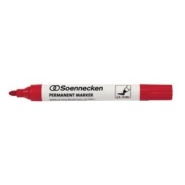 Soennecken Permanentmarker 1,5-4mm schwarz Rundspitze · Strichstärke: 1,5-4 mm · lichtbeständig gegeben: Ja · wasserfest: Ja · Schreibfarbe: rot · schnelltrocknend: Ja · Material des Schaftes: Kunststoff · Farbe des Schaftes: weiß · Druckmechanik vorhanden: Nein · Clip vorhanden: Nein · Bezeichnung der Schreibflüssigkeit: Tinte · Ausführung der Spitze: Rundspitze · Ausführung der Griffzone: rund · kann einige Tage offen liegen bleiben ohne einzutrocknen: Nein · wischfest: Ja