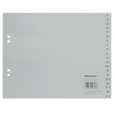 Die Register sind reißfest und umweltfreundlich. · Anzahl der Registerblätter: 20 Registerblätter · Maße: 22,5 x 18 cm (B x H) · Werkstoff: Polypropylen · Verwendung für Papierformat: DIN A4 · Stärke: 0,12 mm · Ausführung des Registers: halbe Höhe · Ausführung der Tabe: A-Z · Ausführung der Lochung: 4fach Lochung · Farbe: grau