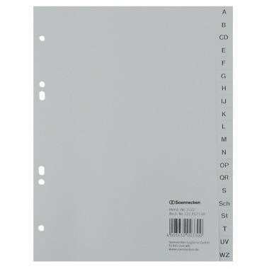 Die Register sind reißfest und umweltfreundlich. · Ausführung der Tabe: A-Z · Verwendung für Papierformat: DIN A5 · Stärke: 0,12 mm · Werkstoff: Polypropylen · Maße: 16,3 x 21 cm (B x H) · Ausführung der Lochung: 6fach Lochung · Anzahl der Registerblätter: 20 Registerblätter · Farbe: grau · Ausführung des Registers: volle Höhe