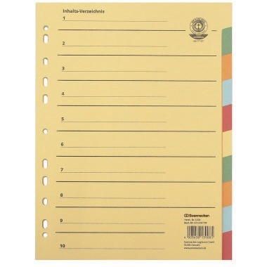 Inhaltsverzeichnis mit Beschriftungslinien. · Maße: 22,5 x 30 cm (B x H) · Verwendung für Papierformat: DIN A4 · Farbe: farbig sortiert · Höhe: 300 mm · Grammatur: 250 g/m² · Ausführung des Registers: volle Höhe · Ausführung der Tabe: blanko · Ausführung der Lochung: 11fach Lochung · Anzahl der Registerblätter: 10 Registerblätter · Werkstoff: Recyclingkarton · Breite: 225 mm