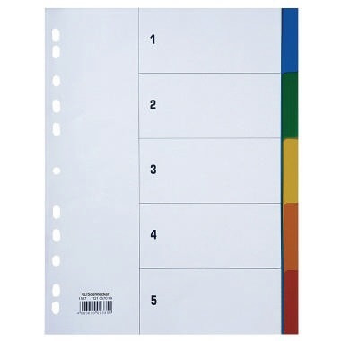 Mit weißen Registerdeckblatt aus Papier. Deckblatt mit Zahlen vorbedruckt. · Höhe: 297 mm · Farbe: farbig sortiert · Zertifikat/Zulassung: Blauer Engel · Werkstoff: Polypropylen · Verwendung für Papierformat: DIN A4 · Maße: 22,5 x 29,7 cm (B x H) · Breite: 225 mm · Anzahl der Registerblätter: 5 Registerblätter · Blauer Engel: Ja · Ausführung des Registers: volle Höhe · Ausführung der Tabe: blanko · Ausführung der Lochung: 11fach Lochung · Deckblatt vorhanden: Ja · Stärke: 0,115 mm