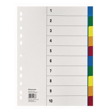 Mit weißen Registerdeckblatt aus Papier. Deckblatt mit Zahlen vorbedruckt. · Breite: 225 mm · Zertifikat/Zulassung: Blauer Engel · Werkstoff: Polypropylen · Verwendung für Papierformat: DIN A4 · Stärke: 0,115 mm · Maße: 22,5 x 29,7 cm (B x H) · Höhe: 297 mm · Anzahl der Registerblätter: 10 Registerblätter · Deckblatt vorhanden: Ja · Blauer Engel: Ja · Ausführung des Registers: volle Höhe · Ausführung der Tabe: blanko · Ausführung der Lochung: 11fach Lochung · Farbe: farbig sortiert