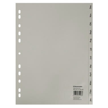 Soennecken Monatsregister 22,5 x 29,7 cm (B x H) DIN A4 Jan.-Dez. Polypropylen grau 12 Registerblätter · Maße: 22,5 x 29,7 cm (B x H) · Breite: 225 mm · Werkstoff: Polypropylen · Verwendung für Papierformat: DIN A4 · Stärke: 0,12 mm · Anzahl der Registerblätter: 12 Registerblätter · Ausführung des Registers: volle Höhe · Ausführung der Tabe: Dez.-Jan. · Ausführung der Lochung: 11fach Lochung · Höhe: 297 mm · Farbe: grau