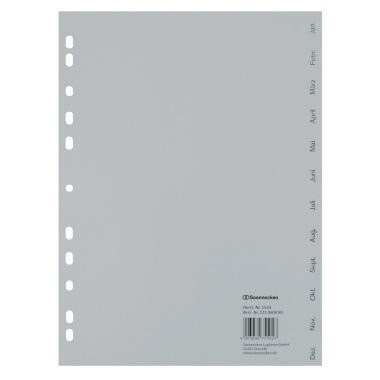Soennecken Monatsregister 22,5 x 29,7 cm (B x H) DIN A4 Jan.-Dez. Polypropylen grau 12 Registerblätter · Breite: 225 mm · Werkstoff: Polypropylen · Verwendung für Papierformat: DIN A4 · Stärke: 0,12 mm · Maße: 22,5 x 29,7 cm (B x H) · Farbe: grau · Ausführung des Registers: volle Höhe · Ausführung der Tabe: Jan.-Dez. · Ausführung der Lochung: 11fach Lochung · Anzahl der Registerblätter: 12 Registerblätter · Höhe: 297 mm