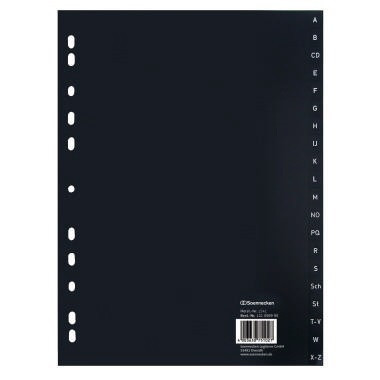 Die Register sind reißfest und umweltfreundlich. · Farbe: schwarz · Werkstoff: Polypropylen · Verwendung für Papierformat: DIN A4 · Maße: 22,5 x 29,7 cm (B x H) · Ausführung des Registers: volle Höhe · Ausführung der Tabe: A-Z · Ausführung der Lochung: 11fach Lochung · Anzahl der Registerblätter: 20 Registerblätter · Stärke: 0,12 mm