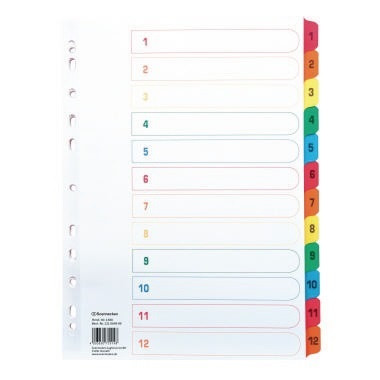 Mit mylar-verstärkte Taben. · Deckblatt vorhanden: Ja · Werkstoff: Karton · Verwendung für Papierformat: DIN A4 · Maße: 22,3 x 29,7 cm (B x H) · Farbe: farbig sortiert · Ausführung des Registers: volle Höhe · Ausführung der Tabe: 01. Dez · Ausführung der Lochung: 11fach Lochung · Anzahl der Registerblätter: 12 Registerblätter · Grammatur: 170 g/m²