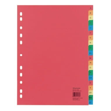 Die Register sind reißfest und umweltfreundlich. · Stärke: 0,12 mm · Ausführung des Registers: volle Höhe · Werkstoff: Polypropylen · Verwendung für Papierformat: DIN A4, Überbreite · Anzahl der Registerblätter: 20 Registerblätter · Maße: 24,5 x 29,7 cm (B x H) · Ausführung der Tabe: A-Z · Ausführung der Lochung: 11fach Lochung · Farbe: farbig sortiert