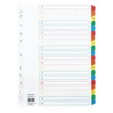 Kunststoffregister, farbiger Pressspan-Karton. Mit mylar-verstärkten Taben. · Deckblatt vorhanden: Ja · Werkstoff: Karton · Verwendung für Papierformat: DIN A4 · Maße: 22,3 x 29,7 cm (B x H) · Farbe: farbig sortiert · Ausführung des Registers: volle Höhe · Ausführung der Tabe: A-Z · Ausführung der Lochung: 11fach Lochung · Anzahl der Registerblätter: 20 Registerblätter · Grammatur: 170 g/m²