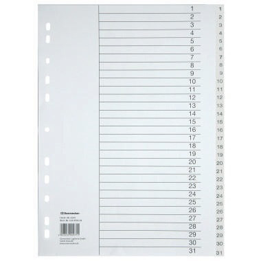 Reißfest und umweltfreundlich. · Farbe: weiß · Verwendung für Papierformat: DIN A4 · Stärke: 0,12 mm · Werkstoff: Polypropylen · Grammatur: 165 g/m² · Ausführung des Registers: volle Höhe · Ausführung der Tabe: Jan 31 · Ausführung der Lochung: 11fach Lochung · Anzahl der Registerblätter: 31 Registerblätter · Maße: 22,5 x 29,7 cm (B x H) · Deckblatt vorhanden: Ja