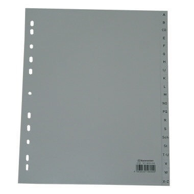 Die Register sind reißfest und umweltfreundlich. · Ausführung des Registers: volle Höhe · Werkstoff: Polypropylen · Verwendung für Papierformat: DIN A4, Überbreite · Stärke: 0,12 mm · Farbe: grau · Ausführung der Tabe: A-Z · Ausführung der Lochung: 11fach Lochung · Anzahl der Registerblätter: 20 Registerblätter · Maße: 24,5 x 29,7 cm (B x H)