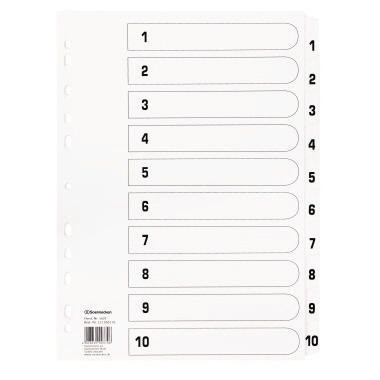 Mit mylar-verstärkten Taben. · Farbe: weiß · Verwendung für Papierformat: DIN A4 · Werkstoff: Karton · Maße: 22,3 x 29,7 cm (B x H) · Grammatur: 170 g/m² · Deckblatt vorhanden: Ja · Ausführung des Registers: volle Höhe · Ausführung der Tabe: 01. Okt · Anzahl der Registerblätter: 10 Registerblätter · Ausführung der Lochung: 11fach Lochung