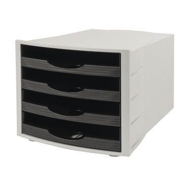 Für eine geordnete und übersichtliche Ablage. Attraktiv und zugleich stabil sorgen sie für Platz auf Ihrem Schreibtisch oder im Schrank. · Griffloch vorhanden: Nein · Verwendung für Papierformat: DIN A4 · Tiefe: 365 mm · stapelbar: Ja · rutschfest: Ja · Maße: 29 x 23,3 x 36,5 cm (B x H x T) · Höhe: 233 mm · Griffmulde vorhanden: Ja · Werkstoff: Polystyrol · Anzahl der Schubfächer: 4 Schubfächer · Format der Schubladen: 4 x breit · Farbe der Schublade: schwarz · Breite: 290 mm · Beschriftungsfeld vorhanden: Ja · Auszugsperre vorhanden: Ja · Ausführung des Öffnungszustandes: offen · Ausführung der Lieferzusammenstellung: inkl. Gummifüßchen · Gehäusefarbe: lichtgrau