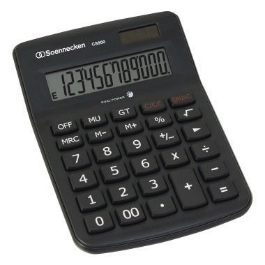 Soennecken Tischrechner CS900 143 x 46 x 206 mm (B x H x T) Solar-Energie, Batterie schwarz · Vorzeichenwechseltaste vorhanden: Ja · Netzanschluss vorhanden: Nein · Prozentrechnung möglich: Ja · Schnellkorrekturtaste vorhanden: Ja · Speicher: 1 Speicher (3 Tasten) · Summe/Zwischensumme möglich: Nein · Summenbildung möglich: Ja · Tiefe: 46 mm · weitere Funktionen: Quadratwurzel, Bruttomargentaste · Masse (Gewicht): 150 g · Tausenderunterteilung vorhanden: Ja · Art des Displays: LCD · Mehrwertsteuerautomatik vorhanden: Ja · Maße: 144,5 x 205 x 46 mm (B x H x T) · Art der Hilfsenergie: Solar-Energie · Ausführung des Displayanzeige-Umfangs: 1 x 12-stellig · automatische Abschaltung vorhanden: Ja · Breite: 144,5 mm · Doppelnulltaste vorhanden: Ja · Farbe: schwarz · Grand Total-Speicher vorhanden: Ja · Höhe: 205 mm · LCD-Anzeige vorhanden: Ja
