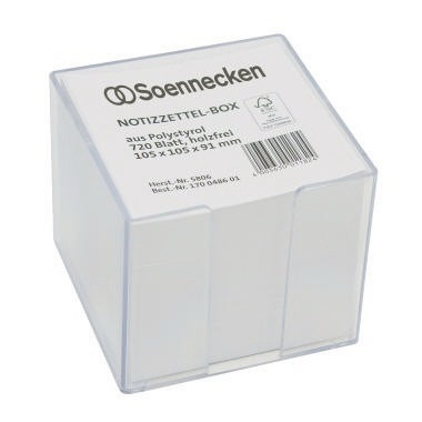 Soennecken Zettelbox 10,5 x 10,5 x 9,1 cm (B x H x T) 9,7 x 9,7 x 8,2 cm (B x H x T) gefüllt 720 Bl. Kunststoff transparent · Maße: 10,5 x 10,5 x 9,1 cm (B x H x T) · Verwendung für Papiergrößen: 9,7 x 9,7 x 8,2 cm (B x H x T) · max. Anzahl der Blätter: 720 Bl. · Farbe: transparent · Farbe des Papiers: weiß · Deckel vorhanden: Nein · Werkstoff: Kunststoff · gefüllt: Ja