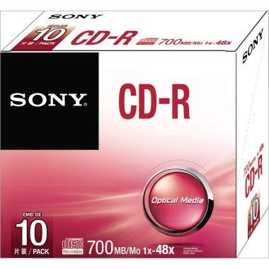 Die hochwertigen CD-R Medien von Sony eignen sich ideal für alle tagtäglich anfallenden Aufgaben. Egal ob für Daten oder Musik - dank ihrer Zuverlässigkeit sind Sony CD-R Medien die perfekte Wahl. Inkl. der gesetzlichen Pauschalabgaben. · Kapazität des Speichers (unkomprimiert): 700 Mbyte · Verhältnis der Schreibgeschwindigkeit: 48x · bedruckbar: Nein · Ausführung des Inhalts (Packung): 10 St./Pack. · Ausführung des Behälters: Slimcase · Aufnahmedauer: 80 min
