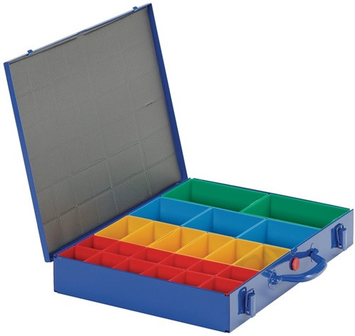 aus Stahlblech · Schaumstoffpresspolster im Deckel · ein Sicherheitsverschluss verhindert unbeabsichtigtes Öffnen · herausnehmbares, beschriftbares Fächersortiment · Systemfächer: 12 Stück 54 x 54 x 63 mm, rot 6 Stück 54 x 108 x 63 mm, gelb 3 Stück 108 x 108 x 63 mm, blau 2 Stück 108 x 162 x 63 mm, grün Lieferbare Ersatzboxen siehe: 54 x 54 x 63 mm, rot, Art.-Nr. 90 00 449 708 + 54 x 108 x 63 mm, gelb, Art.-Nr. 90 00 449 716 + 108 x 108 x 63 mm, blau, Art.-Nr. 90 00 449 709 + 108 x 162 x 63 mm, grün, Art.-Nr. 90 00 449 718 + (gehören nicht zum Lieferumfang)