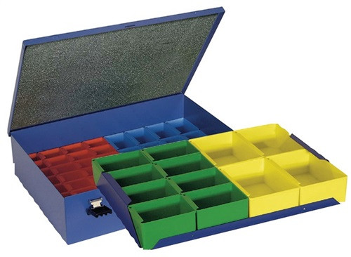 aus 0,75 mm Stahlblech · Schaumstoffpresspolster im Deckel fixiert Kleinteile · stabiles, durchgängiges Scharnierband · umweltfreundliche Pulverbeschichtung · ergonomisch geformter Kunststoffgriff und Doppelverschluss · zentrale Sicherheitsfeder verhindert unbeabsichtigtes Öffnen · herausnehmbares, beschriftbares Dosensortiment mit Quick-Entnahmeleiste · Entnahme-Zwischenboden: 4 Stück H 62 x B 167 x T 117 mm, gelb 8 Stück H 62 x B 83 x T 117 mm, grün Systemdosen: 16 Stück H 48 x B 83 x T 57 mm, blau 32 Stück H 48 x B 41 x T 57 mm, orange