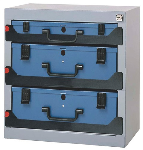aus Stahlblech · Sicherheitsschloss, Schubladen-Einzelverriegelung · serienmäßig mit leichtgängigen Teleskop-Vollauszügen · umweltfreundliche Pulverbeschichtung · Wandbefestigungssatz enthalten · stapelbar · die Kastendeckel sind im herausgezogenen Schub voll zu öffnen · hohe Belastbarkeit · Sicherheitsschloss mit 2 Schlüsseln Bestückungsmöglichkeit: 1 x Art.-Nr. 40 00 871 490 und 2 x Art.-Nr. 40 00 871 492 Lieferung erfolgt ohne Sortimentskästen