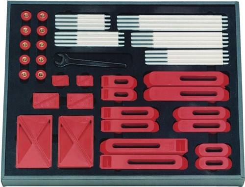 bestehend aus 55 Elementen · Spannpratzen, -unterlagen und Muttern aus hochfestem Kunststoff PBT, rot · Stiftschrauben: Aluminium eloxiert Anwendung: Geeignet für den Einsatz auf 3D-Koordinatenmessmaschinen, Gravier- und Funkenerosionsmaschinen, sowie für alle Aufspannungen die nur geringe Spann- und Haltekräfte erfordern. Die mögliche Spannkraft (ca. 500 N), je nach gewähltem Hebelverhältnis der Spannpratzenabstützung, wird durch Anziehen der Mutter am Rändel erreicht. Haben sich die Spannelemente verklemmt, kann die Mutter mit einem Maulschlüssel gelöst werden. Vorteil: · Gewicht nur 1/4 gegenüber Elementen aus Aluminium und 1/10 gegenüber Elementen aus Stahl. · Korrosionsbeständig gegen Handschweiß. · Sehr leichte Handhabung. · Keine Maschinentisch- und Werkstückbeschädigung. · Vielseitig kombinierbar. · Weitere technische Eigenschaften Breite: 370 • Länge: 440mm • Material: Kunststoff • Höhe: 50mm