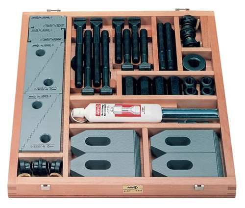 mit federndem Spanneisenhalter · enthält alle notwendigen Elemente zum schnellen Aufspannen von Werkzeugen, Vorrichtungen oder Werkstücken auf T-Nutentischen · alle Teile sind aus Vergütungsstahl, sie sind auswechselbar und können jederzeit ersetzt werden · die Lieferung erfolgt im Holzkasten mit abnehmbarem Klappdeckel · Weitere technische Eigenschaften Inhalt: 55 teilig • Sechskantmuttern: 6 x M20 • Universalspannunterlagen: 4 x Gr. 2, 4 x Gr. 3 • Schraubenpaste: ja • Ringmaulschlüssel: 1 x Gr. 30 x 30mm • Verlängerungsmuttern: 4 x M20 • Federnde Spanneisenhalter: 4 x Gr. 4 • Spanneisen mit Treppenzähnen: 4 x Gr. 22 x 160mm • Kegelpfannen Form: G 6 x M20 • Nutenräumer: 1 x Gr. 22 - 32mm