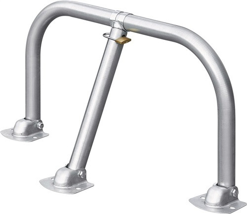 kippbar · Stahl, feuerverzinkt, Ø 48 mm · abschließbar mit Vorhangschloss, verschiedenschließend · Bodenplatte zum Aufschrauben (inkl. Befestigungsmaterial) · Gesamtbreite 850 mm, Höhe über Flur 455 mm