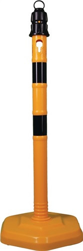 Polypropylen · Pfosten Ø 63 x Höhe 1000 mm · Fuß 370 x 75 mm · schnelle Verbindung des Fußes mit dem Pfosten durch Bajonettverschluss · Pfosten gelb mit 2 schwarzen Streifen und Öse am Pfostenkopf · Weitere technische Eigenschaften Fuß-Ø: 370 x 75mm • Gewicht: 4,2kg • Ø: 63mm