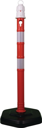mit Sechseckfuß · Polypropylen · Pfosten Ø 63 x H 1000 mm · Fuß 370 x 75 mm · schnelle Verbindung des Fußes mit dem Pfosten durch Bajonettverschluss · Pfosten rot mit 2 weißen, reflektierenden Streifen · mit Öse am Pfostenkopf · Weitere technische Eigenschaften Fuß-Ø: 370 x 75mm • Gewicht: 4,2kg • Ø: 63mm