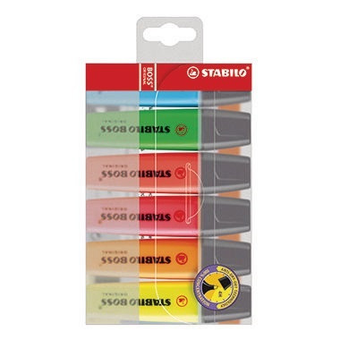 Textmarker für alle, die sich aufs Wesentliche konzentrieren müssen. Unvergleichlicher Design-Klassiker - seit 1971. Hohe Offenlagerfähigkeit. STABILO Anti-Dry-Out Technology: 4 Stunden Austrocknungsschutz für konzentriertes Arbeiten. Einfach und günstig nachfüllbar. Ressourcenschonend durch Einsatz von Recyclingmaterial. · kann einige Tage offen liegen bleiben ohne einzutrocknen: Nein · Ausführung der Farbe: farbig sortiert · Strichstärke: 02. Mai mm · Spitze austauschbar: Nein · Schreibfarbe: rot, blau, grün, gelb, orange, pink · schattenfrei kopierbar: Ja · nachfüllbar: Ja · lichtbeständig gegeben: Ja · Technik des Tintenspeichers: Kapillarsystem · Ausführung der Spitze: Keilspitze · Farbe des Schaftes: rot, blau, grün, gelb, orange, pink · Druckmechanik vorhanden: Nein · Clip vorhanden: Nein · Bezeichnung der Schreibflüssigkeit: Tinte auf Wasserbasis · Ausführung des Inhalts mit Packung: 6 St./Pack. · inkjet geeignet: Nein · Ausführung der Vorschubmechanik: Kappenmodell
