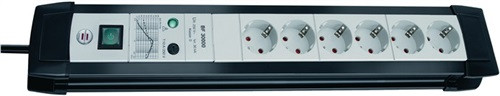 mit Überspannungsschutz und Netzfilter 30000 A · garantierter Schutz vor hohen Überspannungen und starken Stromstößen · Dreileiteranordnung schützt vor Phase, Neutral- und Schutzleiter · mit Thermosicherung, zusätzlicher Schutz vor unzulässig hoher Erwärmung der Varistoren und zum Trennen der Netzspannung bei starker Überspannung · mit 10 Ampere Sicherung, auswechselbar · Sicherheitsschalter beleuchtet, 2-polig ein-/ausschaltbar · hochwertiger Schutz vor HF-Störungen durch integrierten Filter · spezielle Steckdosenanordnung für Netzgeräte · Gesamtlänge der Steckdosenleiste = 55 cm