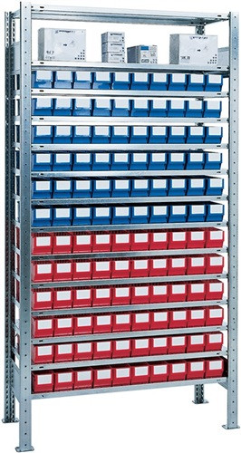 komplett mit PROMAT Lagerboxen und Sichtlagerkästen · einfache und schnelle Steckmontage mit vormontierten verzinkten Rahmen · Fachböden verzinkt mit verstärktem Kastenprofil, H 25 mm, höhenverstellbar im 25-mm-Raster · Tragfähigkeit pro Fachboden 150 kg · Feldlast 1300 kg Regalmaße: H 2000 x B 1000 x T 400 mm Regalaußenmaße: Grundregal + 60 mm, Anbauregal + 6 mm, Tiefe + 36 mm · Lagerboxen: Gr. 3 = L 400 x B 91 x H 81 mm Gr. 4 = L 400 x B 183 x H 81 mm Sichtlagerkästen: Gr. MK 4 = L 230/200 x B 150/140 x H 130 mm · Weitere technische Eigenschaften Anzahl Regalkästen x Gr.: 60 x 3 blau, 60 x 3 rot • Ausstattung: Stahlböden • Feldlast: 1200kg
