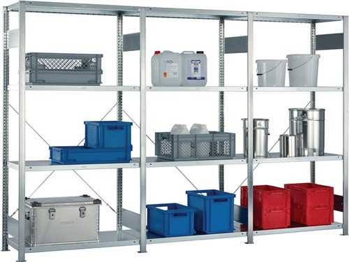 bestehend aus: 1 Grund- und 2 Anbauregalen mit jeweils 4 Fachböden · verzinkt · Modulbauweise · schnelle Steckmontage · Fachböden im 25-mm-Raster höhenverstellbar · T-Profilrahmen mit vormontierten Verbindungsblechen · 150 kg Tragfähigkeit je Boden (bei gleichmäßig verteilter Last), Feldlast 900 kg Grundregal: Nennlänge + 56 mm Nenntiefe + 36 mm Anbauregal: Nennlänge + 6 mm Nenntiefe + 36 mm · Weitere technische Eigenschaften Oberfläche: verzinkt