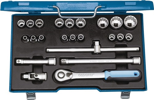 12,5 mm (1/2")-Vierkantantrieb · mit geschmiedeten, vergüteten Steckschlüsseleinsätzen · handbetätigt Inhalt: 1 Hebelumschaltknarre, feinverzahnt, mit Umschalthebel und Druckknopfauslösung, Rückschwenkwinkel 6° je 1 Steckschlüssel-Einsatz (Ausführung siehe Tabelle) SW 8 - 9 - 10 - 11 - 12 - 13 - 14 - 15 - 16 - 17 - 18 - 19 - 21 - 22 - 24 - 27 - 30 - 32 mm 1 Quergriff mit Gleitstück je 1 Verlängerung 125 + 250 mm 1 Kardangelenk