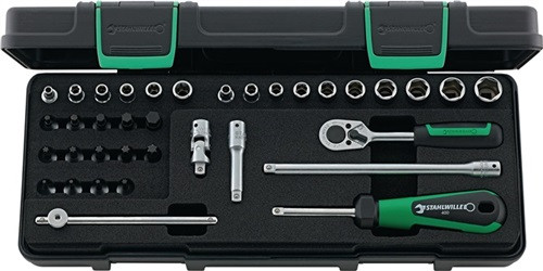 6,3 mm (1/4")-Vierkantantrieb · Inhalt: je 1 6-kant Steckschlüssel-Einsatz SW 5 - 5,5 - 6 - 7 - 8 - 9 - 10 - 11 - 12 - 13 mm je 1 Steckschlüssel-Einsatz für Schrauben mit Außen TORX®-Profil Gr. E 4 - E 5 - E 6 - E 7 - E 8 - E 10 je 1 Steckschlüssel-Einsatz für Schrauben mit Innensechskant-Profil SW 3 - 4 - 5 - 6 - 8 mm je 1 Steckschlüssel-Einsatz für Schrauben mit Innen-TORX®-Profil Gr. T 8 - T 9 - T 10 - T 15 - T 20 - T 25 - T 27 - T 30 - T 40 1 Hebelumschaltknarre mit 2-Komponentengriff (22 Zähne) je 1 Verlängerung 54 mm, 150 mm 1 Kardangelenk 1 Handgriff mit Vierkant 1 Quergriff · Weitere technische Eigenschaften Breite: 134mm • Länge: 322mm • Material: Chrom-Alloy-Stahl • Höhe: 57mm