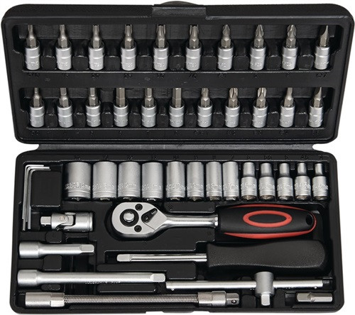 6,3 mm (1/4″)-Vierkantantrieb · Steckschlüssel-Einsätze und Bedienelemente · matt verchromt · Hebelumschaltknarre mit 2-Komponenten-Griff Inhalt: 1 Hebel-Umschaltknarre (Stecknuss-Auswurf auf Knopfdruck) je 1 6-kant- Steckschlüssel-Einsatz SW 4 - 4,5 - 5 - 5,5 - 6 - 7 - 8 - 9 - 10 - 11 - 12 - 13 - 14 mm je 1 Steckschlüssel-Einsatz für Schrauben mit Innen-TORX®-Profil Gr. T 10 - T 15 - T 20 - T 25 - T 30 - T 40 je 1 Steckschlüssel-Einsatz für Schrauben mit Innensechskant-Profil SW 3 - 4 - 5 - 6 - 7 - 8 mm je 1 Verlängerung 50, 100 mm je 1 Steckschlüssel-Einsatz für Schlitzschrauben 4 - 5,5 - 7 mm je 1 Steckschlüssel-Einsatz für Schrauben mit Kreuzschlitz (PH) Gr. 1, 2, 3 je 1 Steckschlüssel-Einsatz für Schrauben mit Kreuzschlitz (PZD) Gr. 1, 2, 3 1 flexible Verlängerung 1 Griff mit Gleitstück 1 Kardangelenk 1 Handgriff mit Vierkant je 1 Winkelschraubendreher 1,5 - 2 - 2,5 mm · Weitere technische Eigenschaften Antrieb: 1/4″ • Rückschwenkwinkel: 5°