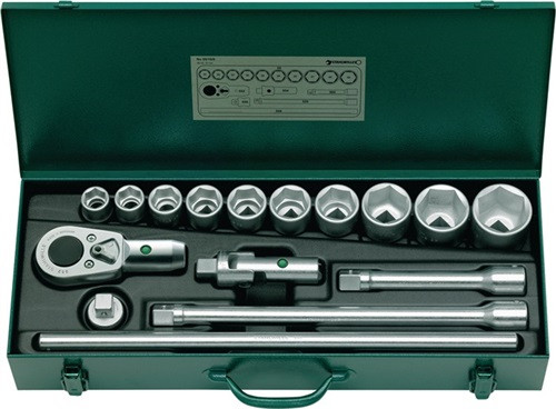 20 mm (3/4 ”)-Vierkantantrieb · Inhalt: je 1 Steckschlüssel-Einsatz 6-kant SW 22 - 24 - 27 - 30 - 32 - 34 - 36 - 41 - 46 - 50 mm 1 Knarrenkopf mit Hebelumschaltung (36 Zähne) 1 Handgriff zum Knarrenkopf 510 mm lang 1 Gleitstück passend zum Handgriff je 1 Verlängerung 200 mm, 400 mm 1 Winkelgelenk · Weitere technische Eigenschaften Breite: 220mm • Länge: 575mm • Material: Chrom-Alloy-Stahl • Höhe: 86mm