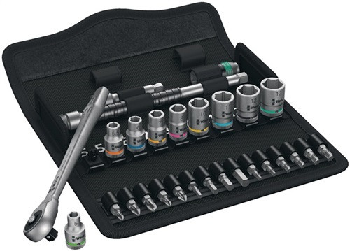 10,0 mm (3/8")-Vierkantantrieb · Steckschlüssel-Einsätze und Bedienungselemente aus Chrom-Vanadium-Stahl · Knarre aus Chrom-Vanadium-Molybdän-Stahl · mattverchromt · Nussverriegelungsfunktion Inhalt: 1 feinverzahnte Durchsteckknarre mit unverlierbarem Vierkant, Rückschwenkwinkel 4,7° je 1 6-kant Steckschlüssel-Einsatz SW 8 - 10 - 12 - 13 - 15 - 16 - 17 - 18 - 19 mm 1 Verlängerung mit Schnelldrehhülse 200 mm 1 Wobble-Verlängerung 76 mm 1 Verbindungsteil mit Schnellwechselfutter 10,0 mm (3/8")-Innenvierkant auf 6,3 mm (1/4")-Innensechskant (zum Antrieb von Schrauberbits mit einer Knarre) je 1 Bit für Schrauben mit Kreuzschlitz (PH) Gr. 1, 2, 3* je 1 Bit für Schrauben mit Kreuzschlitz (PZD) Gr. 1, 2* je 1 Bit für Schrauben mit Innen-TORX®-Profil Gr. T 15 - T 20 - T 25 - T 27 - T 30 - T 40* je 1 Bit für Schrauben mit Innensechskant-Profil Gr. 3 - 4 - 5 - 6 - 8 mm* * Bitlänge jeweils 50 mm Besondere Produktvorteile der Knarre: - sehr robuste geschmiedete Vollmetallknarre - extrem schlank, langer Hebel - Nussverriegelungsfunktion - feinverzahnt · Weitere technische Eigenschaften Rückschwenkwinkel: 4,7°