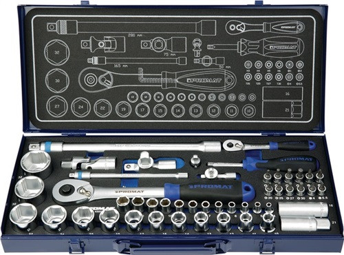 "mit MAGIC Technologie" löst auch bis zu 85% abgerundete Schraubenköpfe und Muttern 6,3 mm (1/4-")- und 12,5 mm ( 1/2")-Vierkantantrieb · Steckschlüssel-Einsätze und Bedienelemente aus CV-Stahl · Schraubeinsätze mit Chrom-Vanadium-Sockel und Klingen aus Nickel-Chrom-Molybdän-Stahl Inhalt: mit 6,3 mm (1/4")- Vierkantantrieb 1 Umschaltknarre, Rückschwenkwinkel 10° (Stecknuss-Auswurf auf Knopfdruck) je 1 PROMAT- Steckschlüssel-Einsatz "mit MAGIC Technologie" SW 4 - 5 - 5,5 - 6 - 6,5 - 7 - 8 - 9 - 10 - 11 - 12 - 13 mm je 1 Steckschlüssel-Einsatz für Schrauben mit Innen-TORX®-Profil Gr. T 20 - T 25 - T 27 - T 30 je 1 Steckschlüssel-Einsatz für Schrauben mit Innensechskant-Profil Gr. 3 - 4 - 5 - 6 mm 1 Verlängerung 50 mm, 1 Verlängerung mit Verriegelung 115 mm, 1 Kardangelenk, 1 Handgriff mit Vierkant, je 1 Steckschlüssel-Einsatz für Schlitzschrauben 4-5,5 mm, je 1 Steckschlüssel-Einsatz für Schrauben mit Kreuzschlitz (PH) Gr. 1 und 2, je 1 6kant-Stiftschlüssel 1,25-1,5-2,0-2,5-3,0 mm, 1 Adapter von 6,3 mm ( 1/4") auf 10,0 mm ( 3/8") mit 12,5 mm (1/2")- Vierkantantrieb 1 Umschaltknarre, Rückschwenkwinkel 10° (Stecknuss-Auswurf auf Knopfdruck) je 1 PROMAT- Steckschlüssel-Einsatz "mit MAGIC Technologie" SW 10 - 11 - 12 - 13 - 14 - 15 - 17 - 19 - 22 - 24 - 27 - 30 - 32 mm je 1 Steckschlüssel-Einsatz für Zündkerzen SW 16, 21 mm Verlängerung 75 mm, 1 Verlängerung mit Verriegelung 280 mm, 1 Kardangelenk 1 Adapter 12,5 mm (1/2") auf 10,0 mm (3/8") Die PROMAT- Steckschlüsseleinsätze "mit MAGIC Technologie" sind echte Problemlöser. Mit ihnen lassen sich sowohl 6-kant-Schrauben/-Muttern als auch bis zu 85% abgerundete Schraubenköpfe und Muttern lösen · Weitere technische Eigenschaften Material: CV-Stahl