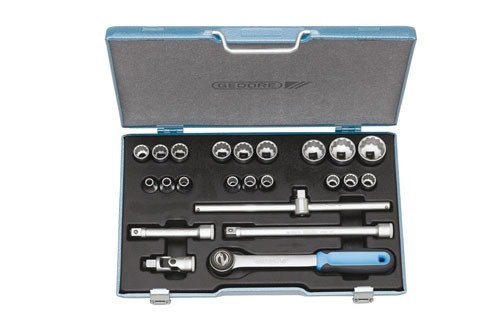 · Mit geschmiedeten, vergüteten, handbetätigten 6-kant UD-Profil (No. 19) oder 12-kant UD-Profil (No. D 19) Steckschlüsseleinsätzen · Mit Betätigungswerkzeugen aus GEDORE Vanadium-Stahl 31CrV3 · Sortiment U-20 mit robuster Hebel-Umschaltknarre, mit Druckknopfauslösung · Sortiment U-3 mit extra feinverzahnter Umschaltknarre · Im GEDORIT blauen Stahlblechkasten · Maße: 425 x 277 x 55 mm