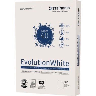 Steinbeis Multifunktionspapier Evolution White DIN A3 80g/m² weiß 500 Bl./Pack. · Grammatur: 80 g/m² · Opazität: 93% · Zertifikat/Zulassung: Blauer Engel, EU Ecolabel · Weißgrad (ISO): 100 · Weißgrad (CIE): 135 CIE · Verwendung für Druck- oder Schreibgerät: Farblaserdrucker, Laserdrucker, Inkjetdrucker, Kopierer, Fax · PEFC: Nein · Papierformat: DIN A3 · beidseitig bedruckbar: Ja · Nordischer Schwan: Nein · Ausführung des Papiertyps: 100 % Altpapier · Laufrichtung: Breitbahn · Blauer Engel: Ja · EU Ecolabel: Ja · Farbe: weiß · Forest Stewardship Council (FSC): Nein · Anzahl der Blätter je Packung: 500 Bl./Pack.